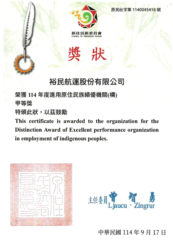 裕民航運股份有限公司今(17)日出席於台北君悅酒店舉辦的「114 年超額進用原住民族機關(構)及廠商頒獎典禮」,榮獲原住民族委員會肯定。 裕民原住民族船員進用比例達 3.04%,充分彰顯公司在推動多元用人政策上的努力與成效。 裕民深信,人才是企業永續發展與創新的核心動力。公司積極延攬來自不同國籍及文化背景的優秀夥伴,持續營造尊重差異、包容多元的職場環境,並透過多元團隊的協作,共同創造共榮共好的未來。對裕民而言,多元、公平與共融(DEI)不僅是一項承諾,更是驅動企業持續創新、邁向永續的重要力量。 分享