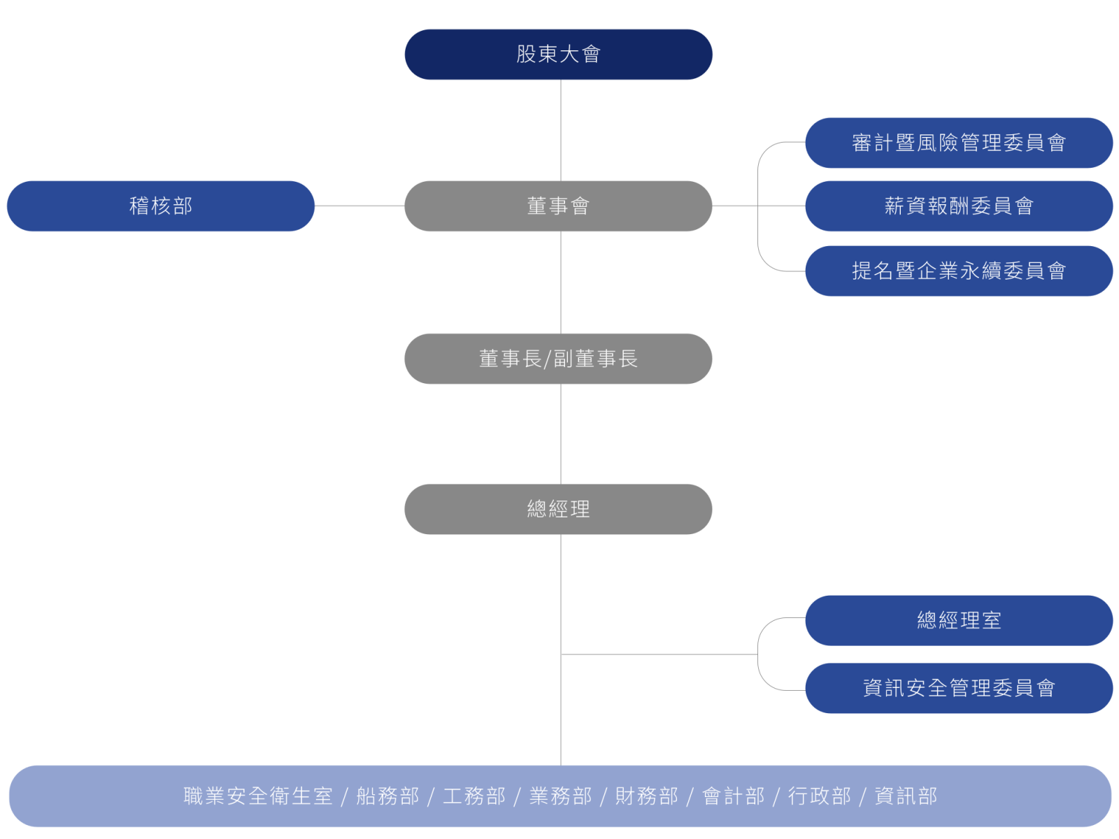 在總經理之下設有資訊安全管理委員會,以強化本公司資安管理,此外設有行政部、會計部、財務部、業務部、工務部、船務部、資訊部及職業安全衛生室等營運部門,採網絡式的扁平化組織管理,提高信息傳遞及工作效率。